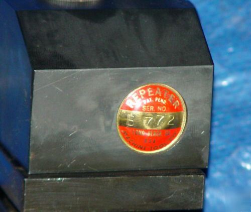 REPEATER QUICK CHANGE TOOL POST WITH 5 HOLDERS FOR LATHES WITH A 12" TO 16" SWING MADE BY REPEATER MACHINE TOOL CO. IN EXCELLENT CONDITION, LIKE NEW 1 TOOL HOLDER NO. B1 - MASTER BAR FOR BORING BARS, 1" CAPACITY 1 TOOL HOLDER NO. B2 - EXTENSION TURNING BAR COMBINATION, 5/8" BIT CAPACITY 1 TOOL HOLDER NO. B3 - TURNING & FACING BAR COMBINATION, 5/8" BIT CAPACITY 1 TOOL HOLDER NO. B4 - THREADING & FACING BAR COMBINATION, 5/8" BIT CAPACITY 1 TOOL HOLDER NO. B5 - PARTING BAR COMBINATION, 1/8" X 7/8" BIT CAPACITY IN EXCELLENT CONDITION, LIKE NEW If you have any questions, please call (***)-255-0848 Or you can email us at rosellafaulkner@machine--tools.com For any information please call B.B. (***)255-0848 Our address is B.B. Vertical 7361 Ethel Ave. Unit #3 N. Hollywood, CA. 91605 (please look at our rules and privacy policy) |