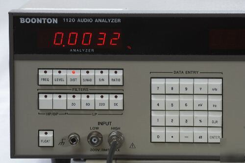 Boonton 1120 S1 Automatic Audio Distortion Analyzer for tube amplifier work - Tested and Like New! This is a high quality distortion analyzer that is very suitable for research lab work on audio amplifiers, communications equipment, and related uses. This is a much more modern unit than the commonly used HP 331 -334 distortion analyzers. The 1120 is digital, auto ranging, auto nulling, and more accurate than the old HP series of analog analyzers. Note that the 1120 also measures frequency, AC and DC voltage and does so with superb accuracy. A power cord and a copy of the complete and comprehensive operator and service manual including calibration routines, schematics, and use instructions on CD is included. There is also a pull-out operator instruction card mounted to the bottom of the instrument and it is in like-new condition. I have been in contact with the engineer who designed this product for Boonton and he offered a bit of additional information: "This unit is an 1120 S/1. The S/1 was a enhanced design that had high reliability components and additional features designed specifically for Military use at the Redstone Arsenal. This product was later sold commercially as the Model 1121 and is sold by Boonton to this day." It is an excellent product. -Cosmetically everything appears to be in nice condition - essentially like new with only minor imperfections. The painted enclosure is clean. Operationally everything appears to work correctly and the measurements agree with my other Boonton 1130 and 1120 analyzers. I have run the basic auto-calibration routines and the instrument appears to be calibrated although my equipment is not iso 9002 certified or NBS calibrated. The interior is like new and in perfect condition. I have tested the distortion, frequency, voltage and output functions of both the signal generator and the analyzer portion of this instrument and these appear to work fine. This is a very complex analyzer with completely programmable and remote controllable capability using the GPIB instrument interface. The calibration is completely automatic requiring only the input of known calibration signals and the initiation of the appropriate calibration routine on the 1120. I have not tested all of the advanced capabilities but I have no reason to believe everything is not operational; The 1120 also passes all of its extensive internal test routines - this is a complex and very capable lab instrument. This is one of the most advanced and desireable audio distortion analyzers available and it sells new today from Boonton as the model 1121 for $ 9,800.00 There are numerous articles posted on the www where audiophiles have shared information and automatic routine programs for this analyzer. I have been using a similar one for my own work and find it to be a superb piece of analytical equipment. The Model 1120 audio analyzer provides fast, accurate measurements including frequency, AC or DC level, distortion, SINAD and signal-to-noise ratio. It also includes an audio source providing accurate low distortion signals over wide frequencies and level ranges. (please look at our rules and privacy policy) |