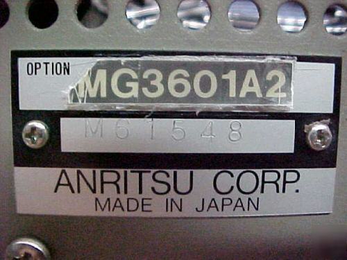 The MG3601A2 is a synthesized signal generator with a frequency range of .1 to 1040 mHz with 10 Hz resolution. It has an output level range of -133 to +13 dBm in .1 dB intervals. The output level can be set in dBm, dBu, mV and uV. The generator output can be unmodulated; Amplitude Modulated (AM) 0-100% using 400 Hz and/or 1 kHz internal modulating frequencies; Frequency Modulated (FM) 0 - 199 kHz deviation using 400 Hz and/or 1 kHz internal modulating frequencies; Phase Modulated (PM) 0 to 999 radians using 400 Hz and/or 1 kHz modulating frequencies. This particular generator has option 02 which is a higher stability 10 mHz internal reference oscillator. This oscillator has an aging rate of 5x10-9/day. The MG3601A2 has a GP-IB interface which allows it to be externally and remotely controlled. It has continuously variable output levels for convenient squelch measurements; reverse power protection up to 50 Watts; frequency memory (100 frequencies); function memory (30 sets of panel settings). The above specifications were obtained from an internet search. I do not have any other information or an operation manual for this generator. However, it is very to use and I will include basic operation instructions. The generator powers up and all functions appear to work. I connected a spectrum analyzer to the generator's output. Photo 1 shows the MG3601A2 producing a 1040 mHz signal into the spectrum analyzer. Photo 2 shows a 500 mHz signal and Photo 3 shows a 1 mHz into the analyzer. Photo 4 shows a 100 kHz signal into an oscilloscope. The spectrum analyzer used does not operate properly at 100 kHz. The signal level does adjust from -133 dBm to +13 dBm. The AM signal does adjust from 0 - 100% modulation; The FM signal does adjust from 0 - 199 kHz deviation; The PM does adjust from 0 - 999 radians. This is the only testing I have done on this unit. There is a calibration sticker on the generator indicating the performance was verified 1/11/06. Consequently, it will need the calibration checked if traceable accuracy is required. It is in good physical condition with a few scratches from normal use. The front panel has a very small dent in the upper left corner and a surface ding in the upper right corner. Neither of these affect the operation of the generator. (please look at our rules and privacy policy) |