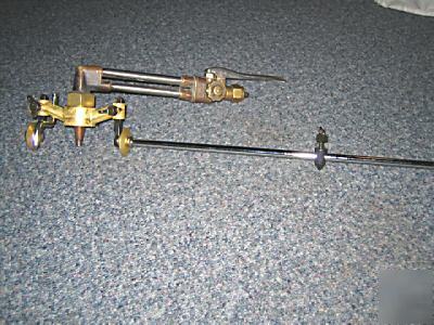 This a BRAND NEW circle cutting tool is made for Victor and Uniweld series 100 handles. It is a muli-purpose tool as you can use it to cut straight lines while holding the tip at a consistant distance from the material. Did you ever wonder why some people can make such great cuts?? Well this tool is the secret. For circle cutting all you need to do is find the center of the circle and punch a small indent with your center punch. The circle cutting tool will then pivot around that point making great cuts every time. The body is made of brass. The torch is allowed to pivot freely inside the collar. Or for straight lines you can tighten the tip in by means of a wing nut. Works GREAT. Cuts holes from about 1 inch to 30 inches. The wheels are adjustable for flame height. I have made an extra arm for mine that allows me to cut beveled circles with both the torch and plasma cutter. It was very easy. I will have to get pics of that one. It saves on the grinding!! I have even easily modified one of these to work with a PLASMA CUTTER and it Works GREAT. It saves the tips on the plasma cutter by keeping the right distance from the plate. In fact I have the guys in my shop asking to borrow it all the time. TORCH AND THE TIP IN THE PHOTO ARE NOT INCLUDED. (please look at our rules and privacy policy) |